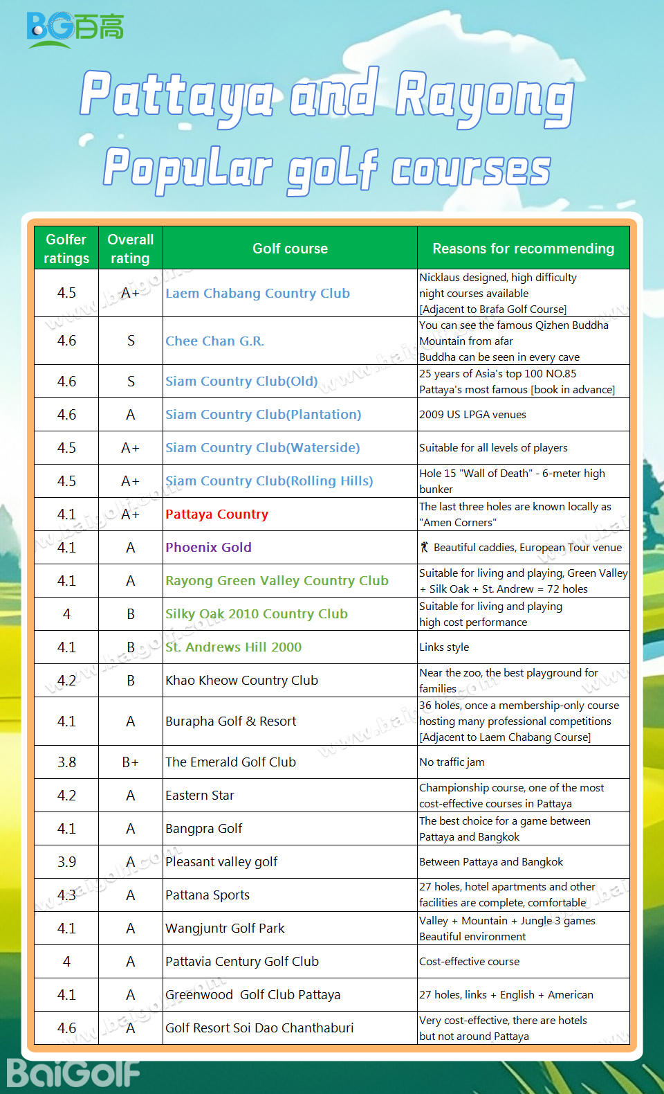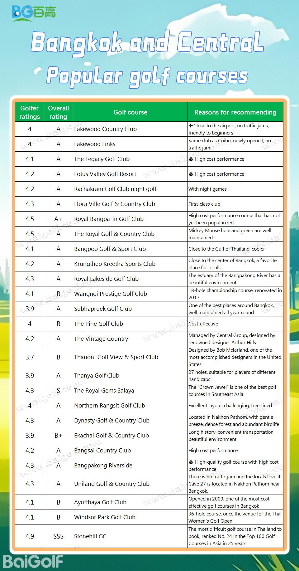 3.9 | B+ | Ekachai Golf & Country Club | Long history, convenient transportation, beautiful environment |