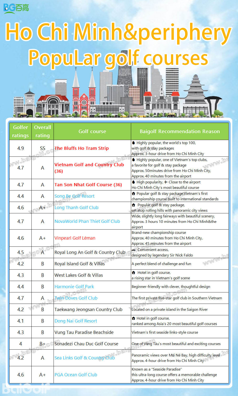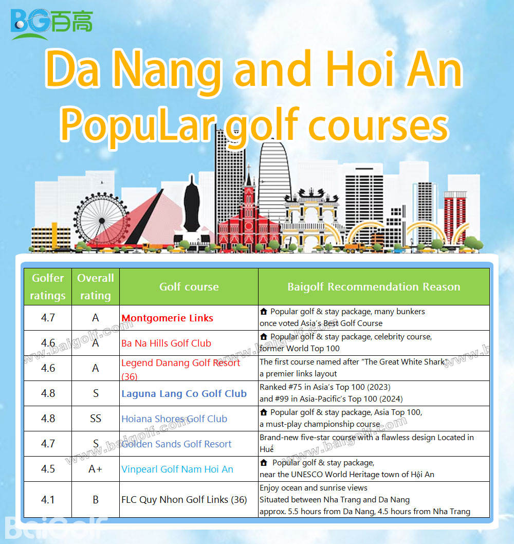 4.7 | A | Vietnam Golf and Country Club (36) | Highly popular, a favorite for golf & stay package — one of Vietnam’s top clubs |