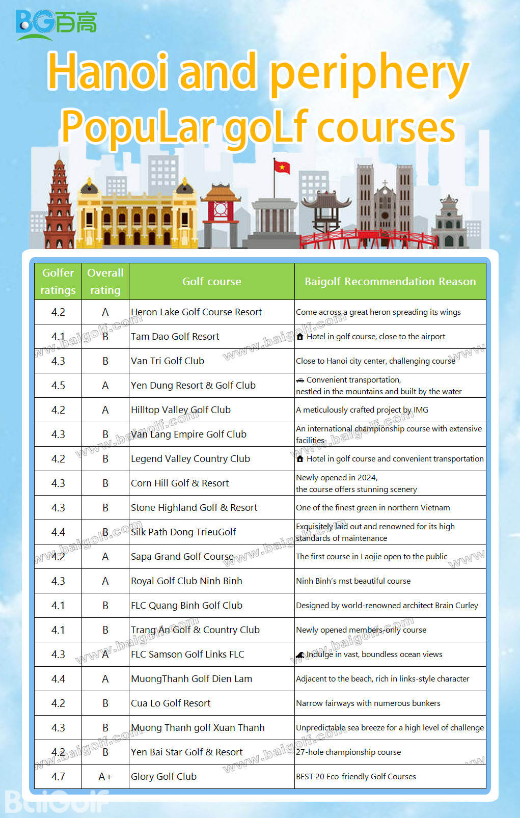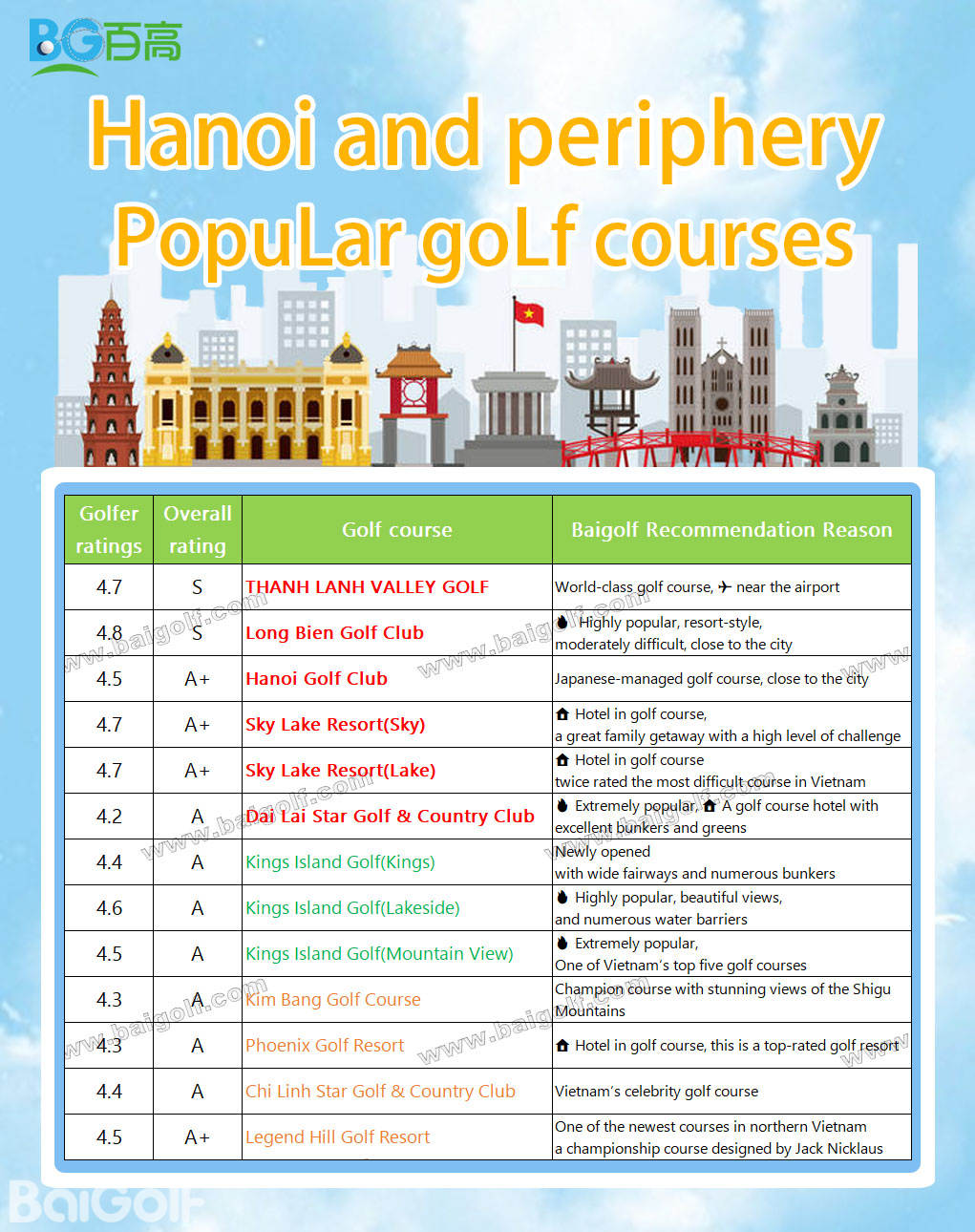 4.5 | A+ | Hanoi Golf Club | Japanese-managed golf course, close to the city |