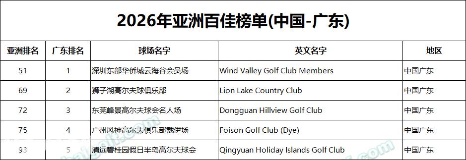 广东地区表现非常强势,狮子湖、东莞峰景、广州风神戴伊场、清远碧桂园假日半岛悉数上榜,是华南地区高尔夫旅游的核心目的地。