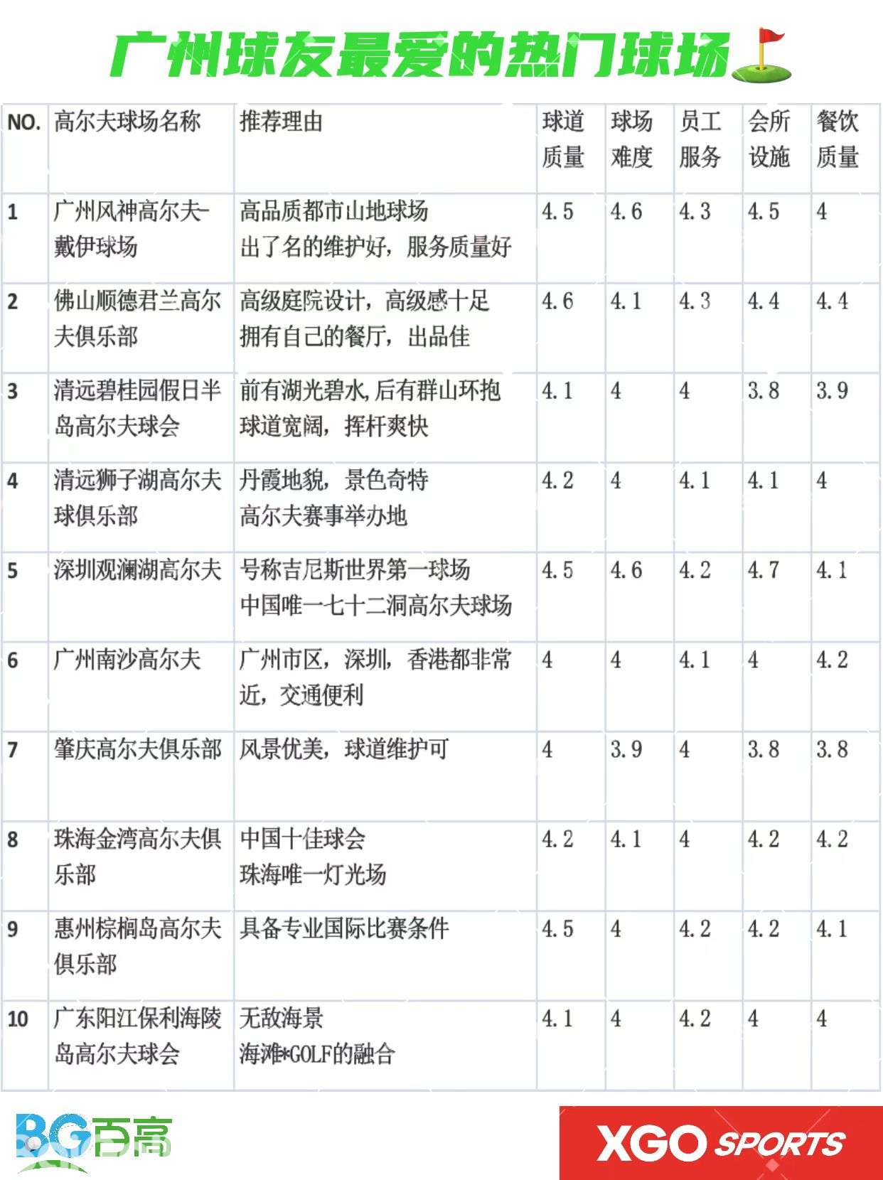 | 1 | 广州风神高尔夫-戴伊球场 | 高品质都市山地球场 出了名的维护好,服务质量好 | 4.5 | 4.6 | 4.3 | 4.5 | 4 |