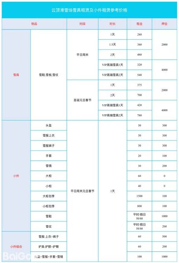 下表为张家口崇礼云顶滑雪场滑雪票价格表,云顶滑雪场有自带板和含雪具两种类型雪票,自带板票为缆车票,含雪具票为缆车票加鞋板杖。平日周末假日票价不同,平日指周一至周五,周末指周六周日,假日指元旦春节。请下载百高app下单或咨询百高小客服!