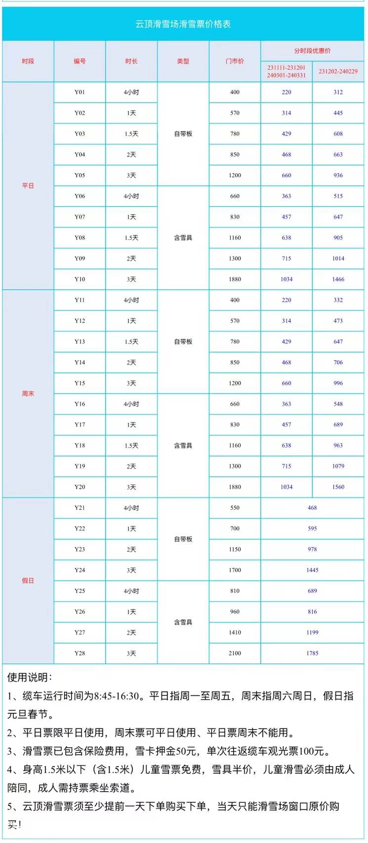 2023年-2024年雪季崇礼云顶滑雪场滑雪票价格表