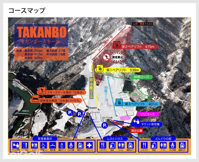 Takanbo Ski Resort is popular among young people as it is easy to get to in 5 minutes from Gokayama IC. There are four courses depending on the level, so everyone from small children to adults can enjoy it. During the peak season, you can enjoy high quality powder snow. If you bring your lift ticket with you, you can take a bath at Kuroba Onsen for half the price.