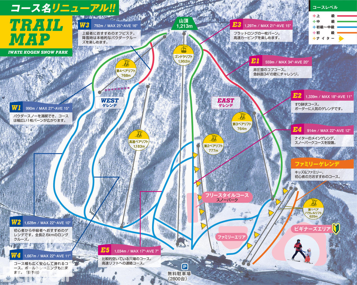 성강석지구의 유일한 케이블카 운행!이번 시즌부터 노선명 갱신!자연지형을 이용한 코스는 모든 종류의 초보자부터 고급자까지 즐길 수 있다.호평받은 초등학생 이하, 승강기·봉미선 무료도 계속!또 센터 광장 내 시설도 충실해 가족도 즐길 수 있다.JR 마쓰오카역 니시구치 버스 종점에서 무료 픽업 버스를 타세요.