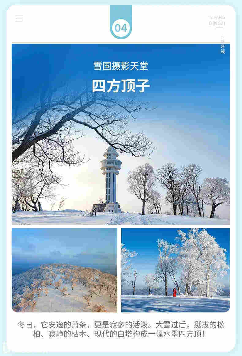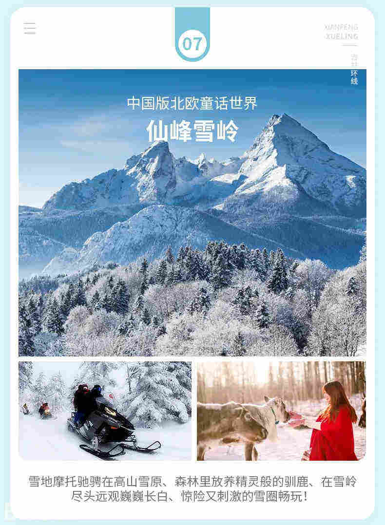 游览14:00-16:00,仙峰雪岭堪称人间仙境,是延边地区最大的雾凇带,绵延数公里景色美不胜言,玉树琼枝,晶莹剔透,这里整个山被大雪覆盖,游走在雪岭仿佛来到了童话世界。乘坐「雪地摩托」一路风驰电掣,穿林海跨雪原,远眺长白山。沿雾凇地带-红松林-高山花园-雪松「徒步」回到山下!山下还有东北的“神兽”萌萌的「傻狍子」,还有可爱的「驯鹿」可以近距离接触,拍照哦!