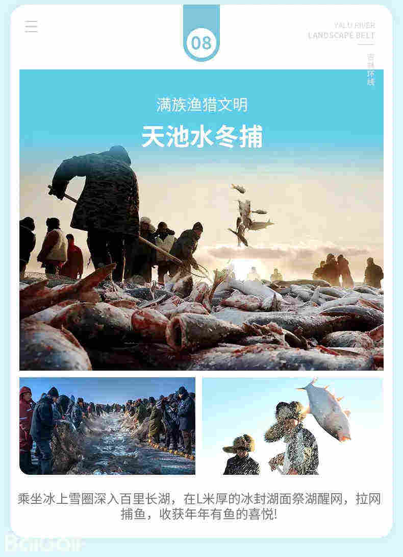 冬捕10:30-11:30,欣赏传统渔猎「冬捕」,冬捕是东北地区独特的一种捕鱼方式。在一米多深的冰面上凿洞下网,随着一个个东北汉子卖力呼喊与拖拽,一条条肥硕的大鱼不断的随网而出。您可以尝试着与渔民一同收渔网、抓头鱼,感受冰腾湖鱼的壮观场面和年年有余的美好祝愿!中餐时间,