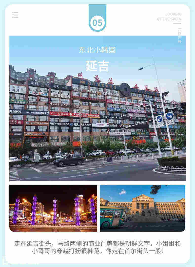 车程16:00-18:00,出发前往【延吉】这是一个充满韩范的城市,朝鲜族比例占一半以上,汉族这里是少数民族。走在延吉街头,马路两侧的商业门牌都的朝鲜文字,人们的穿越打扮也像是首尔街头。