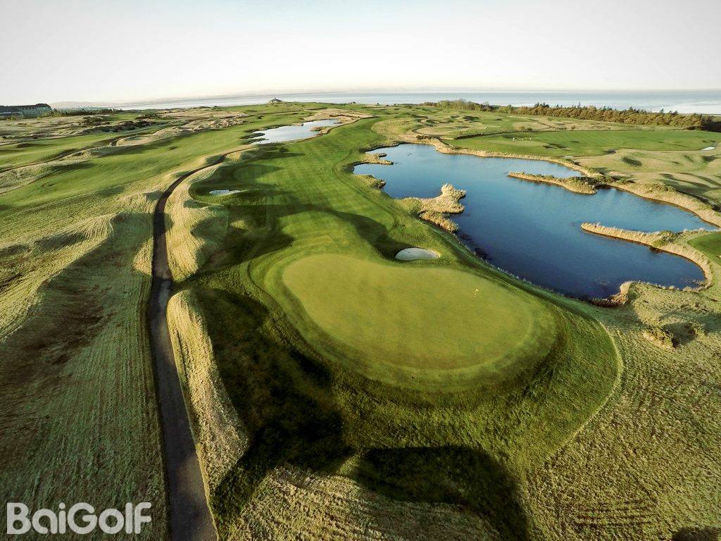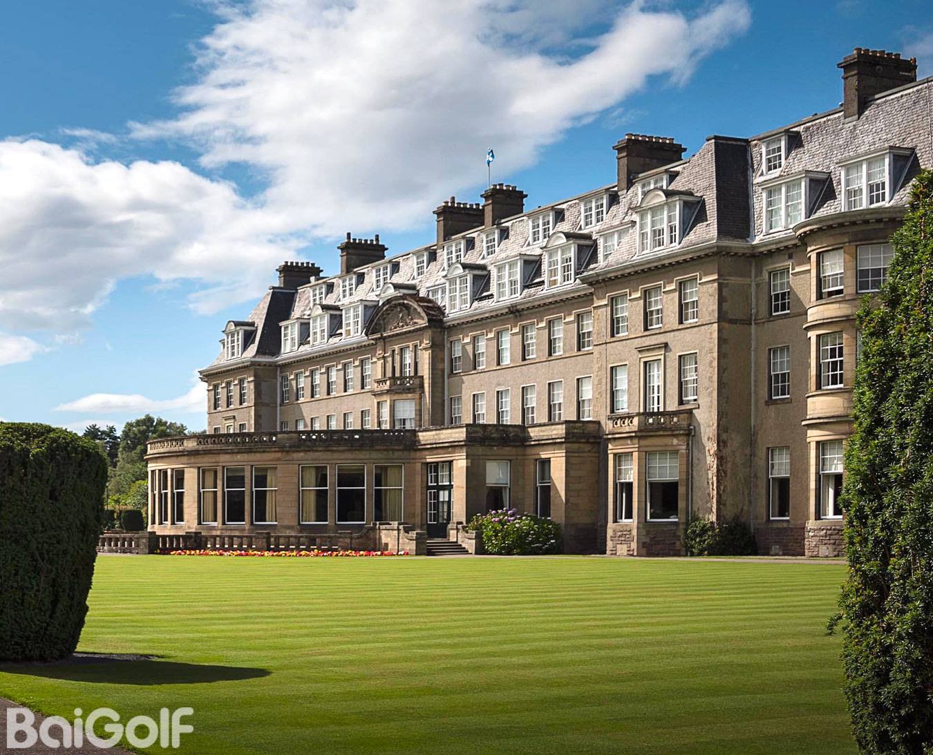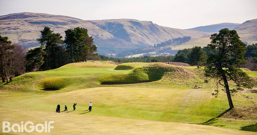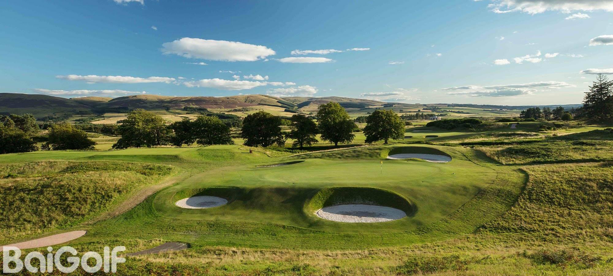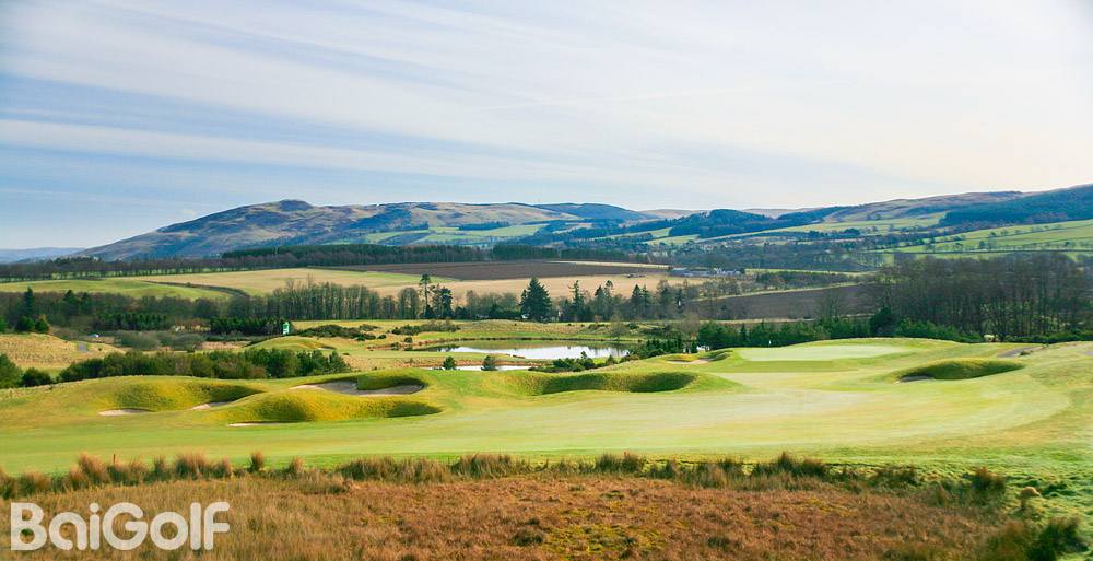 由杰克-尼克劳斯设计的 PGA 百年纪念球场是一座现代经典球场。即使对于尼克劳斯这样的冠军和著名高尔夫建筑师来说,这也必须是一座伟大的球场,因为它坐落在苏格兰的中心地带,而苏格兰正是高尔夫运动的发源地,尼克劳斯将这座球场形容为 "我曾参与工作过的世界上最好的一块土地"。PGA 百年纪念球场的后发球台长达 7088 码,是苏格兰最长的内陆球场。不过,每个球洞的发球台都分为五个阶段,其中从白色标记开始的距离为 6,559 码,从红色标记开始的距离为 5,072 码,极具挑战性。恰如其分的是,PGA 百年纪念球场的起点是东南方向著名的老鹰峡谷,沿着奥其尔丘陵一直延伸到本-希(Ben Shee)下面的山口顶峰,与格兰迪冯(Glendevon)相连。